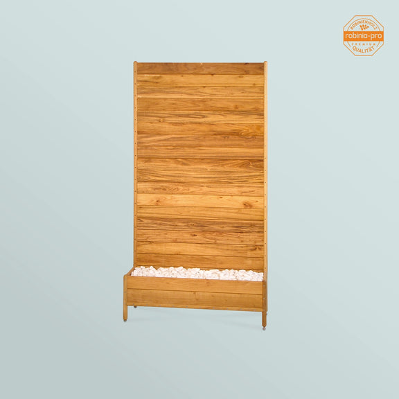 Robiniahout is niet alleen het sterkste van alle inheemse houtsoorten, maar ook het meest duurzame. Dit privacyscherm gaat een leven lang mee. Daarom zijn de gebruikte schroeven en stelvoeten van roestvrij staal.