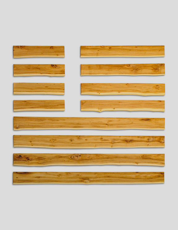Die Lamellen sind von gerade gewachsenen Stämmen gesägt, einseitig besäumt und sägerau belassen.