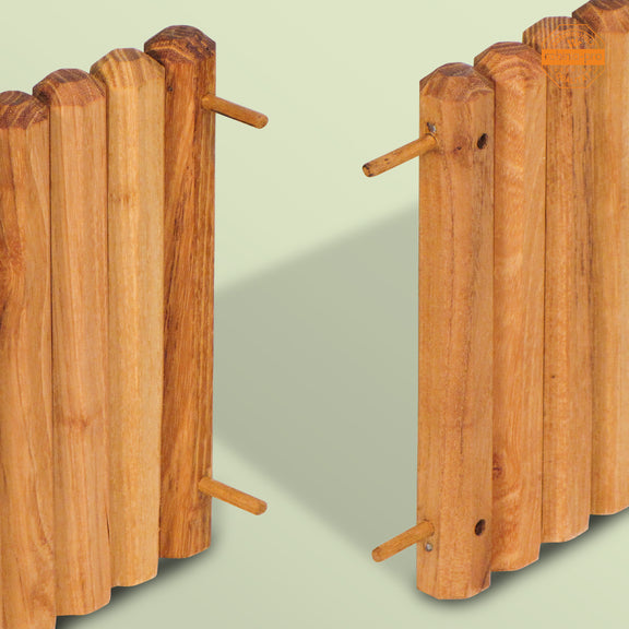 In Längsrichtung sowie im rechten Winkel lassen sich die RASENKANTE-Elemente mittels Robinienholz-Dübeln aneinander fixieren (Dübel werden mitgeliefert).